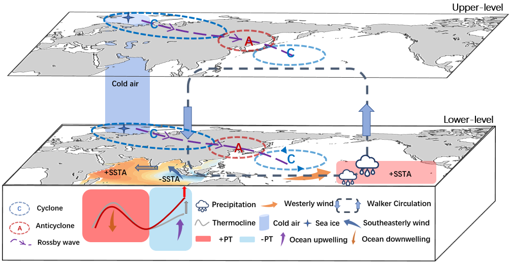 开云登录入口手机版 地球系统数值模拟与应用全国重点实验室陈尚锋研究员团队,联合云南大学、浙江大学和复旦大学相关学者,在气候研究领域国际知名期刊《Journal of Climate》上发表题为"Influence of winter Arctic sea ice anomalies on the following autumn Indian Ocean Dipole development"的研究成果。该研究利用观测数据分析、动力机制诊断和多种数值模式试验,揭示了冬季巴伦支海和格陵兰海海冰异常对次年秋季IOD事件发展的显著影响及其关键物理机制。研究发现,当冬季巴伦支海-格陵兰海海冰偏多(偏少)时,次年秋季易出现正(负)IOD事件。巴伦支海-格陵兰海海冰增多会抑制湍流热通量的向上输送,导致对流层冷却,进而激发了从巴伦支海传至副热带北太平洋的大气罗斯贝波列(图1)。线性斜压模式和大气环流模式均可以再现冬季北极海冰异常激发的大气罗斯贝波列。北极海冰增多引发的北太平洋副热带异常气旋,进一步导致副热带北太平洋海表面温度升高,通过"风-蒸发-海温"反馈机制暖海温异常维持并沿着信风方向传至赤道中太平洋。赤道中太平洋暖海温异常进而激发了异常的热带沃克环流,导致热带东南印度洋出现下沉气流及低层东南风异常,最终通过热带印度洋的海气相互作用机制和海洋动力过程,影响秋季IOD事件的发生与发展(图1)。利用CMIP6多模式试验,研究还发现CMIP6多模式集合平均能够较好再现冬季巴伦支海-格陵兰海海冰异常对秋季IOD事件的影响及其物理过程。