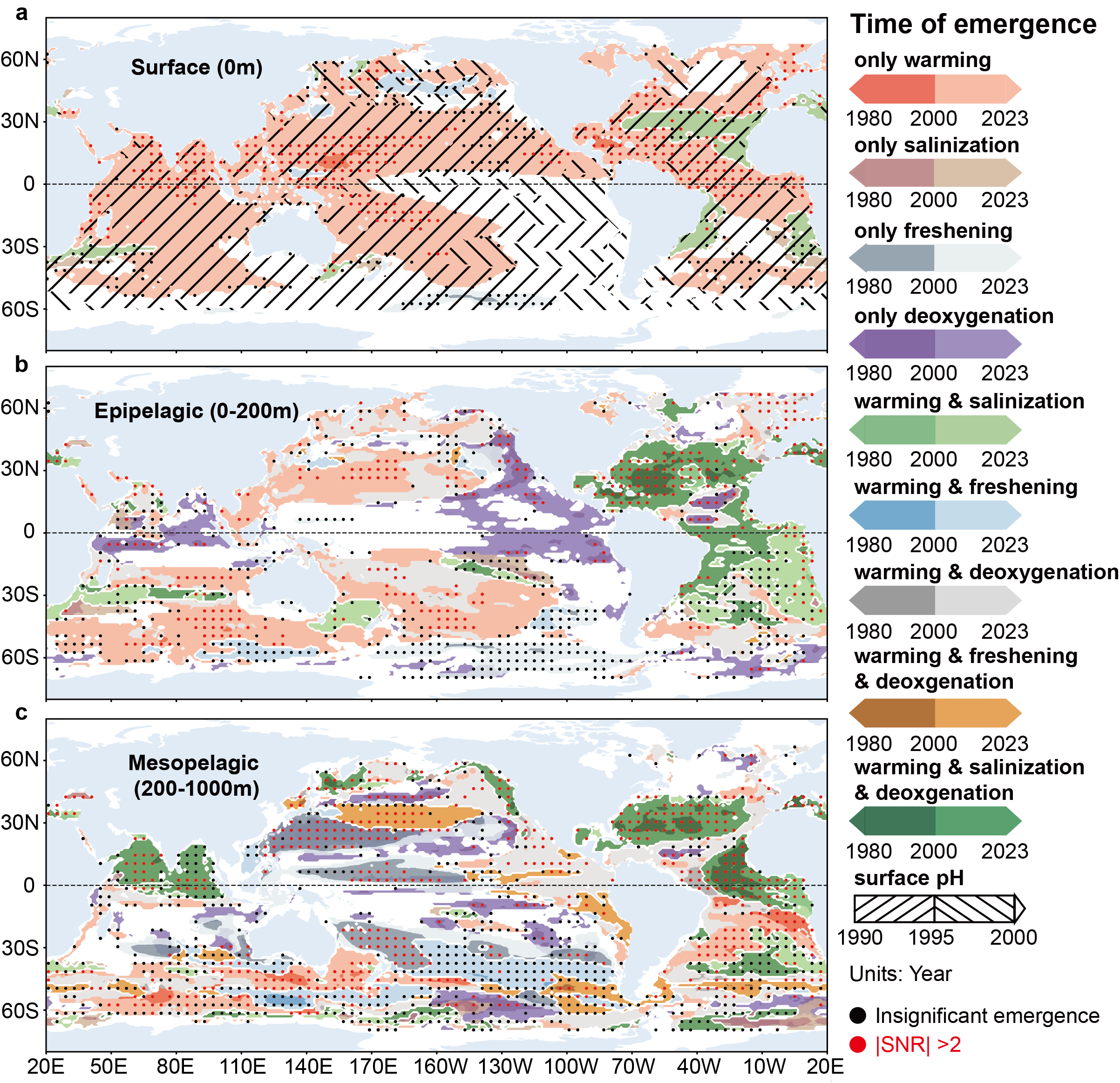 图1. 基于温度、盐度、溶解氧、pH的全球海洋上层1000米复合状态改变的“转变时间”与“方向”(用涌现时间ToE来指示;相对于1960-1989年气候平均态)的空间分布图: (a) 表层, (b) 上层区 (0-200m) 和(c)中层区(200-1000m)。不同颜色表示不同因子转变方向的组合(如变暖&变咸&缺氧等),颜色深浅代表复合状态改变从何时开始。红色打点区域表示气候状态的转变幅度更大、变化更复杂,可能已经超出了历史经验与既有分类。黑色打点区域表示在 95%置信水平上气候状态转变不显著。表层酸化(pH)的状态改变单独用黑色斜线表示。