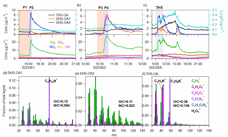 研究发现,三手烟呈现出与二手烟截然不同的化学指纹与释放动力学特征。质谱分析显示,二手烟有机气溶胶以C5H10N+为标志性含氮碎片;而三手烟有机气溶胶则发生了显著的化学转化,主要特征碎片转变为C3H8N+和C2H4N+,且其氮/碳比(N/C)更高(0.136)。值得注意的是,与二手烟气溶胶浓度随时间快速衰减不同,三手烟有机气溶胶能在室内长期维持在~1-2 μg m-3的稳定浓度水平,这证实了三手烟作为室内持续性低剂量污染源的特性(图1)。