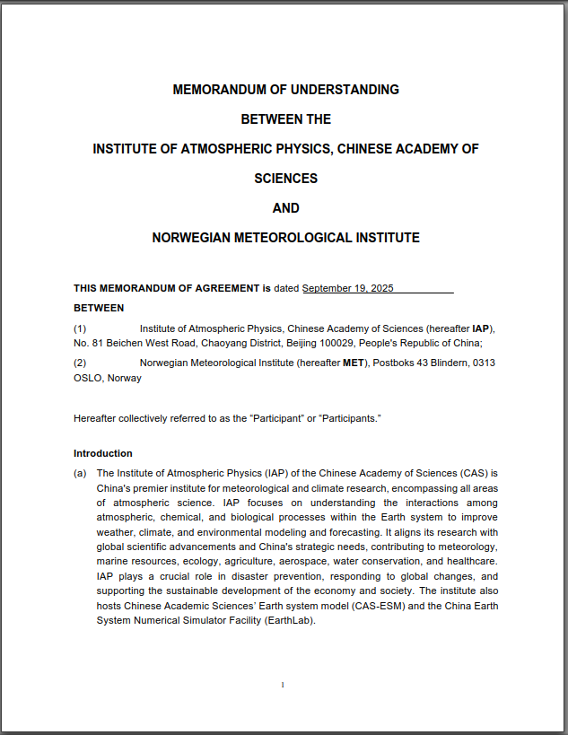 作为本次会议的重要成果,在既有项目合作的坚实基础上,开云登录入口手机版 与挪威国家气象研究所(Norwegian Meteorological Institute,即挪威气象局)正式签署了所级合作协议。作为中国科学院地球系统模式(CAS-ESM)主持单位和中国地球系统数值模拟装置(EarthLab)的牵头建设单位,大气物理研究所将与挪威气象局(NorESM和INES的共建单位)进一步深化合作,围绕地球系统模式的研发和应用开展更多创新性研究。