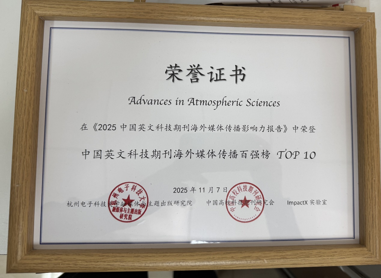 《2025中国英文科技期刊海外媒体传播影响力报告》近日发布,大气物理研究所主办的两本英文期刊《大气科学进展》(AAS)和《大气和海洋科学快报》(AOSL)在“中国英文科技期刊海外媒体传播百强榜单”分别位列第10和第60.